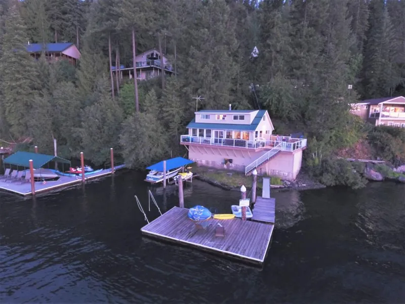 Coeur d'Alene Lake, Cottonwood Bay, 100' frontage, Main Home: 3 bdrms, 1 bath, 1724 sq ft; Guest Cabin: 1 bdrm, 1 bath, 560 sq ft. 180 degree lake views.Spring water system, updated septic system, furnished, tramway for easy access.