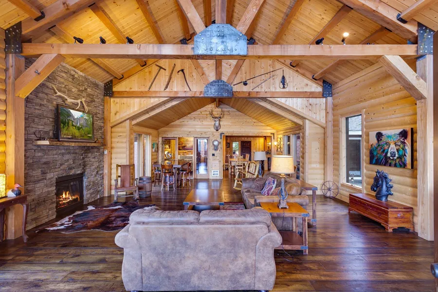 Welcome to Hayden Lake Ranch Lodge! This special waterfront is made for enjoying the good life! 8 bedrooms (2 are Master Suites, 1 non-conforming)-sleeps 21, on 2.25 acres, over 4400 SF with a pond, waterfall, 67 ft sandy beach, dock, pasture for horses, and 2 living areas! Luxury great room addition in 2017 with huge timber trusses and large deck and remodeled kitchen 2021 - perfect for enjoying with all the friends and family. Fun rec room for games (can be converted back to a 3 car garage). Make memories, capture the great rental income - approx $50K per year. Comes Fully Furnished/Turn-key! Rare Hayden Lakefront with acreage, peaceful southern exposure and level sand to waters edge beach!