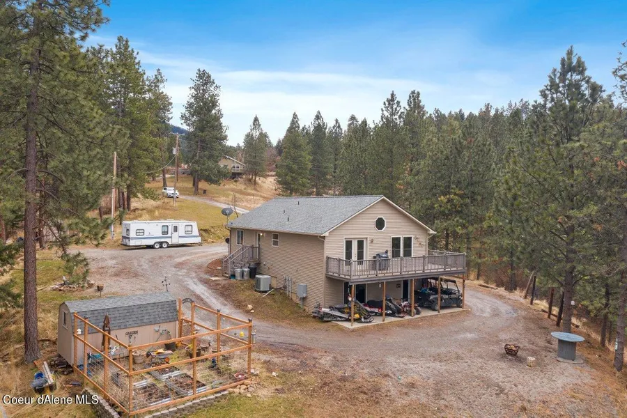 Gorgeous rancher with a walk out basement on 5.3 secluded acres. Close to CDA and Spokane. Seasonal creek runs through the wooded property and has 2 sheds, a chicken coop and under deck storage as well as a fun golf green! Home features an open floor plan with spacious main floor master with walk in closet, 2 large bedrooms downstairs and a family room. Future garage/shop pad includes 220 amp panel. Property has a 3000 gallon water holding tank and an over sized septic tank.