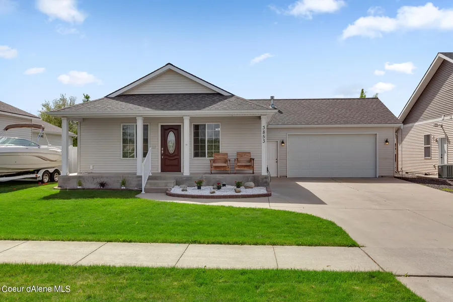 Post Falls Privacy on the Park! Best of both worlds with this 3 bedroom/2 bath single level Post Falls home, conveniently located close to services and across from a neighborhood park. Situated in peaceful Greenside Vistas, this 1,560 sqft home boasts a covered front porch and backyard patio. Master bedroom with jetted tub and walk-in closet. Huge drive- through tandem 3-car attached heated garage (800 sqft) w/shop space and full wall of cabinets. All appliances and W/D included. Gas water heater, fireplace and plumbed to back patio. TDS fiber internet. Low maintenance vinyl siding and fully landscaped.