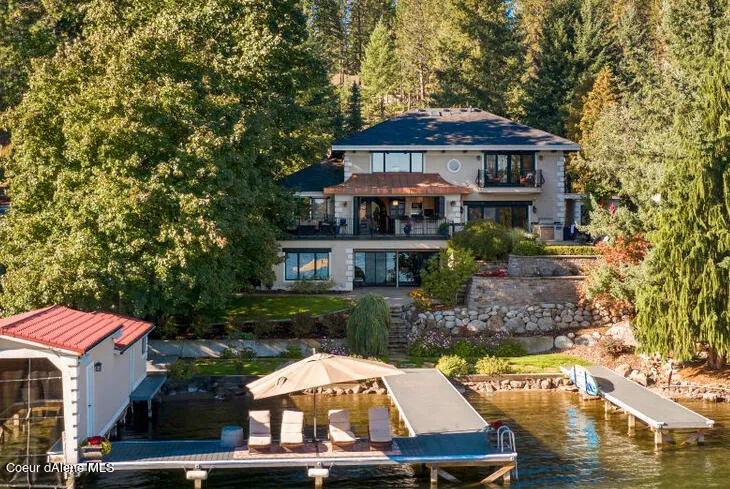 Italian inspired villa on the widest part of the Spokane River! As you arrive at this home you'll come to a circular, heated driveway, gorgeous water feature and landscaping, you'll walk through the large columns at the entry way to a grand entrance showcasing vast views of the river. The details and finishes of this house are of the highest quality with impressive features like nano windows and doors, a wine cellar, bar, movie theater room, gym, 2 docks with a boat house, outdoor kitchen with a real wood burning fireplace and lights draped above you as if you truly were enjoying a glass of wine in Italy. The master suite has 2 decks, one set up for a private hot tub area, a fireplace, a smart bathroom with a TV in the mirror and heated floors. This home will not disappoint you.