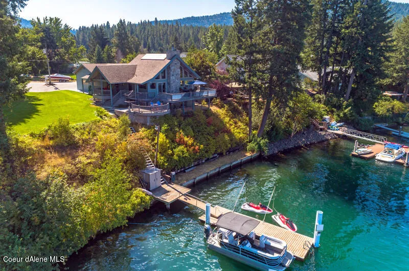 Beautiful sought-after Spokane River Home, in desirable south of the River, Greensferry Bay. This stunning property sits on 164 feet of rare year-round deep-water river frontage with a floating dock. It's open floor plan, deck & yard spill out to the Spokane River, perfect for entertaining, relaxing on a warm summer evening while enjoying the panoramic views of the River, surrounding mountains, and abundant wildlife. Lake CDA is only five nautical miles away. It's interior design has spared no expense with wall to wall windows, main floor master suite, open kitchen & living room floor plan, floor to ceiling stone gas fireplace, skylights, formal dining room, work at home office, substantial three-car garage with one RV bay, and large shop area. The garage and contiguous shop are easily converted to a five-car garage. The lower level is complete with two bedrooms, a kitchenette/laundry ar...