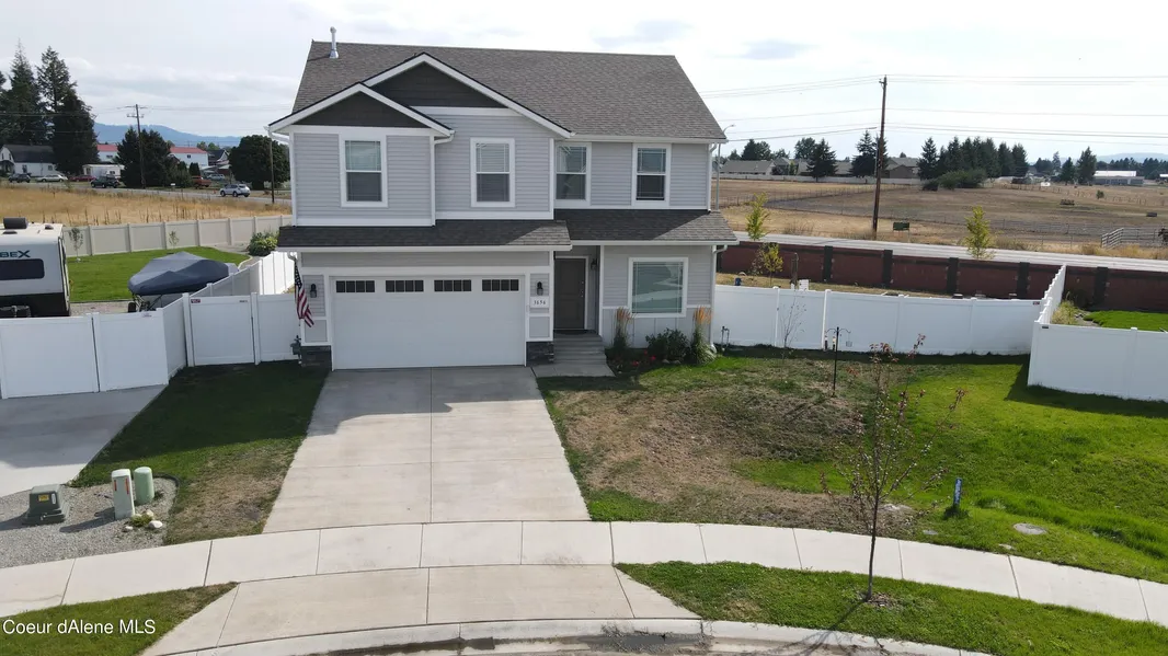 Built in 2022, this 3310 sq ft house sits on almost a third of an acre in Carrington Meadows. Features 2352 sq ft of finished space and a semi-finished 958 sq ft FULL basement with plumbing, electrical, and insulation already installed with the potential for two extra bedrooms and one additional bathroom. The main level is open concept with 9' ceilings, features an office, guest bathroom, kitchen with HUGE walk-in pantry, island with breakfast bar, quartz countertops, a gas stove and gas fireplace in the living room. The house has a deep 2 car garage. Upstairs has a large master suite, 2 bedrooms, a large loft and laundry room. The laundry, office and living room all have built-ins to maximize storage. All conveniently located in Hayden ID.