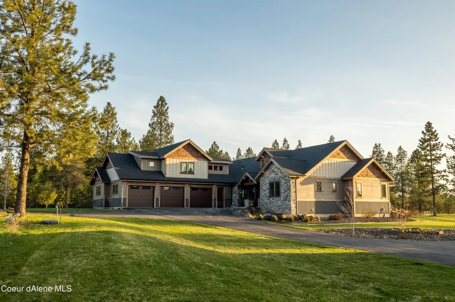 Come home to your own 5 usable park-like acres of beautiful North Idaho. Spend time with friends and family in the open concept living area while looking out at the beautiful grounds and views of Mt Spokane. The chef's kitchen features custom walnut cabinets and an oversized island. The adjacent living room features a grand fireplace to cozy up in front of on those cold winter days. The home features 5 bedrooms, each with a walk-in closet, 4 bathrooms, 9 ft ceilings, and beautiful custom cabinetry and finishes throughout. The master suite features his and her walk-in closets, his and her vanities, an oversized shower featuring a steam room and luxurious soaking tub. The 5 park like acres features a fenced garden, play area, back patio, sitting area, and spa perfect for relaxing on a summer evening. In addition to the oversized 3 car attached garage that features custom storage cabinets, the property boasts an insulated 4,000 sq ft shop that features 3 RV bay doors and a climate -controlled office space perfect to house your toys, hobbies, or as a location for a home-based business. A 1,500-gallon underground propane tank and back-up generator makes this home ready for whatever weather comes your way.