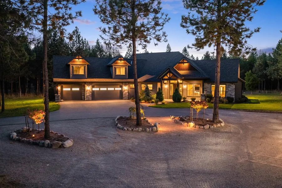 Welcome to Lone Mountain Estates, an exclusive community with 5-acre lots, paved roads, and easy access to Coeur d'Alene, Rathdrum, and Spirit Lake. This custom Timbered Ridge Parade of Homes entry is a masterpiece of design and craftsmanship. The main floor living concept features a custom kitchen with stainless gas appliances, commercial size refrigerator, a walk-in pantry, and two ovens. The luxurious master suite includes a sitting room, three-sided fireplace, patio access, dual walk-in closets, separate vanities, soaking tub, and a multi-head walk-in shower. Additional highlights include vaulted ceilings, covered patio, office, a Jack-and-Jill bath adjoining large 2nd and 3rd bedrooms, a huge versatile bonus room, a mudroom, a spacious laundry room with sink, and custom built-ins throughout. Finally, a large shop with 14' doors, RV parking, an unfinished loft, and a two-bedroom, one...