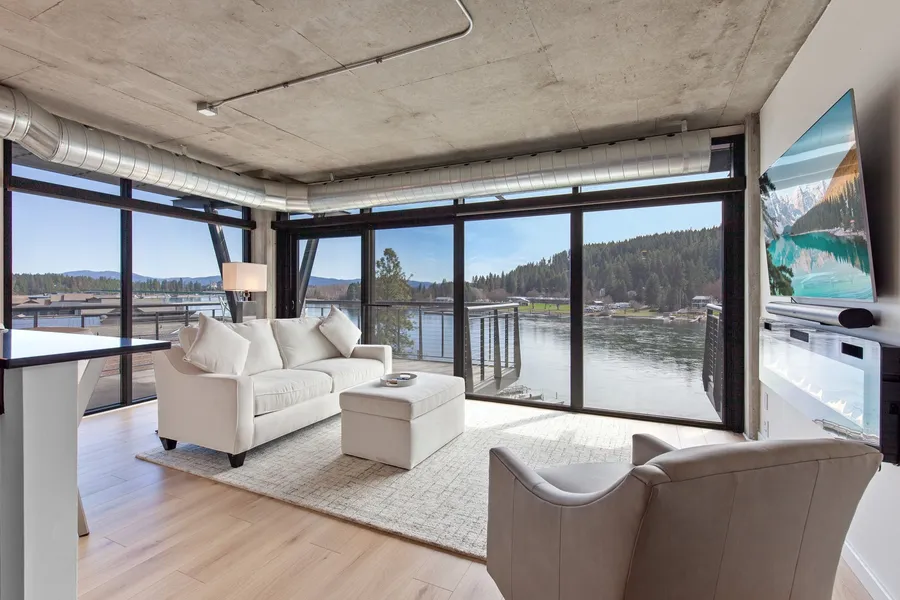 Beautiful Riverfront House Condo with Unobstructed River and Mountain Views. Very chic and newly remodeled has floor to ceiling windows maximizing the gorgeous views in popular Riverstone. Corner unit with large open deck for great outdoor living space. One bedroom that opens to the deck, one bath, laundry room, open living room and kitchen. Day dock with Spokane River access. Excellent building with workout facility and community conference room. Covered parking and large storage area. Exceptional location with restaurants, theater, waterpark, beach and trails all with easy access.