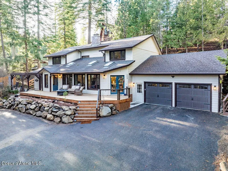 Home was pending for more than 60 days at $1,150,000 however buyer was not able to perform. Home is now priced at $995,000 for a quick sale. Welcome home to this beautifully remodeled home nestled amongst towering pines on .80 of an acre, offering filtered lake views and Located just 1 mile from Hayden Lake Marina. This custom designed and built home is sure to impress with a double floor to ceiling brick fireplace, primary bedroom on the main and open great room concept with windows spanning the length of the home offering beautiful views of the surrounding forest. The kitchen has been completely remodeled with custom cabinetry, large island with seating for 5 and stunning polished quartz counter tops. New Kitchen Aid appliances and a convection 5 burner gas stove with custom hood, recessed lighting, under cabinetry lighting and Pottery Barn pendant lights finish this tastefully designed Kitchen beautifully. The great room is very spacious with vaulted ceilings, gorgeous wood burning fireplace and open to the loft above. The large windows allow ample light and views of the morning sunrises. The formal dining room is also spacious with ample room for a large dining room table. Custom Pottery Barn chandelier, recessed lighting and Jotul gas stove add to the charm. The primary suite off the main living area is oversized with sliding doors to the patio, walk-in closet and beautiful remodeled bathroom. The bathroom was designed with a large walk-in shower finished with Zellige tile, champagne bronze fixtures and custom cabinetry and lighting. The laundry room and full second bathroom are also on the main level with plenty of storage, and fully tiled shower. Upstairs is a spacious loft open to below with a fireplace. Three more bedrooms and full bath are located upstairs. Every bathroom and bedroom have their own heaters with thermostat, allowing energy efficient heating of the entire home. The home also has a Generac whole house generator for when the power goes out. As you drive up to the home you will be greeted with solar powered outdoor lighting, new Trex decking, and stone wall. The paved driveway offers a lot of parking with additional parking for a boat, RV, or other vehicles. There is a new privacy fence along the front of the property hiding the road and homes from view. The home has new paint inside and out, new LVP flooring throughout the main level, new tankless water heater and new lighting and plumbing fixtures. Multiple sky lights are throughout the home as the large two car garage has tall ceilings with overhead storage and cabinetry. This is a special home, on a beautiful piece of property, tastefully remodeled and ready for your Idaho adventures. Just minutes from national forest land, Hayden Lake Marina and Coeur D'Alene.