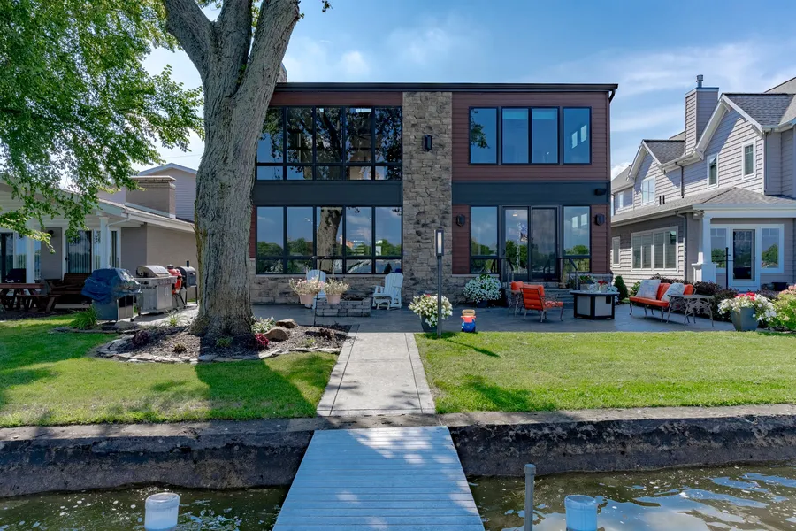 Beautiful location on Lake Wawasee! Located in Sunrise Beach Addition this modern rustic home offers 50 ft of lake frontage on Lake Wawasee along with 50 Ft on Johnson Bay. Built in 2016, enjoy the open floor plan and magnificent views of Lake Wawasee through the front floor to ceiling windows. This beautiful home has space for up to sixteen guests. The kitchen boasts quartz countertops as well as a waterfall edged island that seats up to five guests. The great room has a vaulted ceiling with exposed beams and floor to ceiling stone fireplace with a gas insert. This home has a first-floor primary bedroom with tray ceiling and large ensuite with walk in tiled shower. Wrapping up the first floor you will find a wet bar with kegerator, mudroom, laundry, and office space. Second floor contains a family room with surround sound and queen size Murphey bed, wet bar, three bedrooms with ensuites, bunk room for six, laundry hook up, and common bathroom. The vinyl wood flooring throughout the home stands up to traffic while the Sonos sound system plays music throughout, including outdoor patio and piers. The lakeside patio has a gas lit firepit and natural gas hook up for your outdoor grill. The exterior of the home contains steel siding and stone for maintenance free living. Attached two car garage has coated flooring with overhead storage.