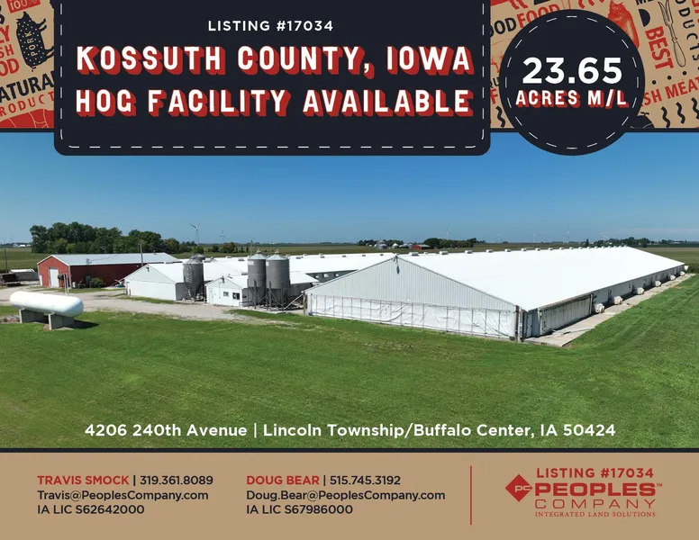 Kossuth County, Iowa Breed-to-Wean Hog Facility - Located approximately eight and one-half miles directly south of the Iowa/Minnesota border, approximately three-quarters of a mile west of the Winnebago County line and in the northeast corner of Kossuth County, Iowa, this breed-to-wean hog facility sits on 23.65 gross acres m/l in Lincoln Township. This facility, originally built in 1985, was updated in 1994 and 2001 and expanded and partially updated to Prop 12 Compliance in 2022.