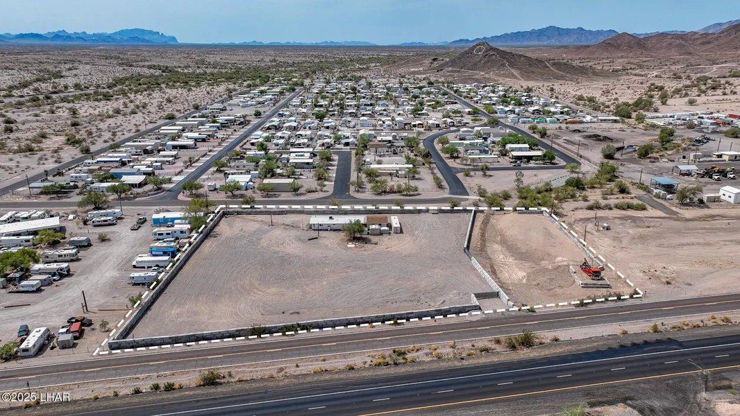 Prime commercial opportunity! This spacious lot is parallel to I-10 and offers excellent visibility, easy access, and TWO entrances for added convenience, perfect for business use or future development. Zoned General Commercial. 2 Bed, 1 Bath home (fixer-upper). Brand new electrical throughout. Two 220 ton mini-split units to be installed. Fully fenced for privacy & security. 4 RV hookups, three-car garage with a brand-new roof. Additional storage buildings plus Connex box. Plenty of space for parking, storage, or expansion. Located in Quartzsite, Arizona, just off Interstate 10, a high-traffic area perfect for commercial visibility. Whether you're looking to run a business, invest, or build your dream setup, this property offers serious potential.
