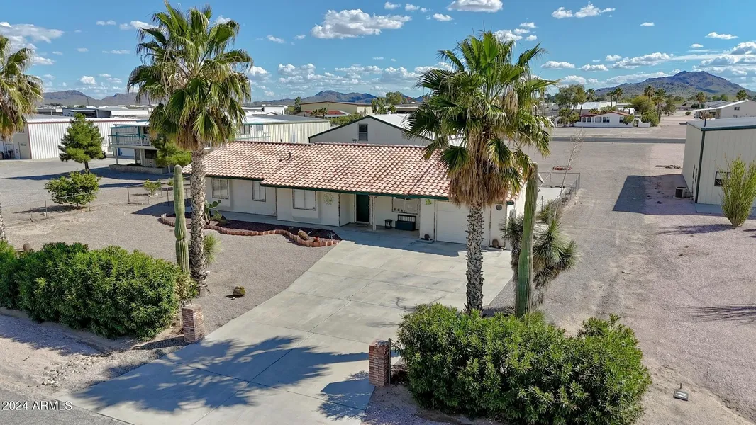 Incredible opportunity to own a hangar home in the coveted Indian Hills Airpark community! Located in the charming, desert town of Salome, Arizona, this amazing property and community both have so much to offer. 48 x 48 hanger with electric bi-fold door and room to store your plane, cars, toys, or boat. The hangar also includes an apartment area with a full kitchen, bathroom, and bedroom, along with an additional bedroom upstairs. Stunning, well-kept Spanish style 2 bed, 2 bath home offering plenty of space to relax and unwind after a long day of off-roading in the desert. The home boasts vaulted ceilings in the living areas and guest bedroom, along with tiled floors throughout except for the master bedroom. Open kitchen with tiled countertops, island, breakfast bar, sink overlooking the backyard, water purification system, new refrigerator, and walk-in pantry. Off the kitchen is a dining area and door to the garage. The spacious great room features a gas fireplace, sliding glass door to the backyard, and storage closet. Your master suite is bright and inviting with a large walk-in closet, beautifully tiled bathroom with walk-in shower, vanity area, separate toilet room, and sliding glass door to the backyard. Additional guest bedroom with vaulted ceiling, large closet, and an oversized, full guest bathroom. Indoor laundry room with washer and dryer included. NEW EXTERIOR PAINT (2025), NEW AC (2022), NEW hot water heater (2022), and NEW roof (2020)! On top of all that, enjoy low energy bills thanks to the home's OWNED solar system. The exterior of the home showcases mature desert landscaping with privacy hedge in the front yard and extra parking spaces in addition to the single car garage. Automatic H2O system to both front and back yard. Indian Hills Airpark is a private airport with a paved runway that was recently resurfaced. Enjoy perfect flying weather practically year-round. You'll never run out of things to do in this active and engaging community. There are plenty of opportunities to meet and socialize with your neighbors during the rotating happy hours, potlucks, dances, and game nights. Fly off to breakfast or lunch with your neighbors throughout the week. The community also includes a clubhouse, pilot's lounge, and exercise facility. Shopping, dining, and golf nearby. An hour to Wickenburg, Buckeye, and Parker. You won't believe the breathtaking 360-degree mountain views and beautiful sunsets. Come see for yourself!