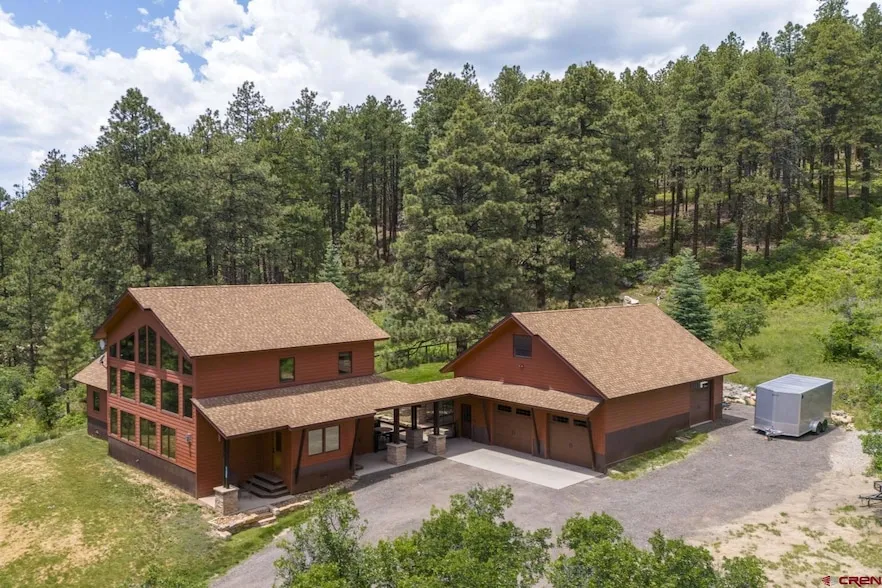 Welcome to this beautifully maintained home tucked away on a serene 1-acre wooded lot in the Forest Lakes community. Built in 2014, this south-facing home offers privacy, functionality, is easily accessible with a relatively flat driveway which is unique to this mountain neighborhood, and borders over 700 acres of state land perfect for nature lovers and outdoor enthusiasts. Step inside to a spacious, light-filled living area featuring large windows that bring the outdoors in. The open-concept kitchen is perfect for entertaining and equipped with a built-in sound system throughout the interior living area and exterior patio which adds a touch of luxury. The primary suite offers convenience and comfort on the main level. Two additional bedrooms in the lofted upstairs with a shared bathroom and extra living space boast views out the expansive windows. Enjoy ample inside parking and storage with an oversized three car garage complete with huge loft storage area, plus the separated bay that is insulated and heated for year round enjoyment that is currently set up as workshop. The easy-access driveway, RV parking with septic and electric hookups available, and beautifully landscaped grounds complete the picture that includes a secured, covered kennel area. Not only does the home border state land, at the end of Hilltop Drive is direct access to San Juan National Forest. The Forest Lakes Neighborhood allows residents to enjoy the amenities of hiking trails and fishing and canoeing in the private Lake Simpatico. Whether you're looking for a peaceful full-time residence or a mountain getaway with room to roam, this Forest Lakes gem has it all.