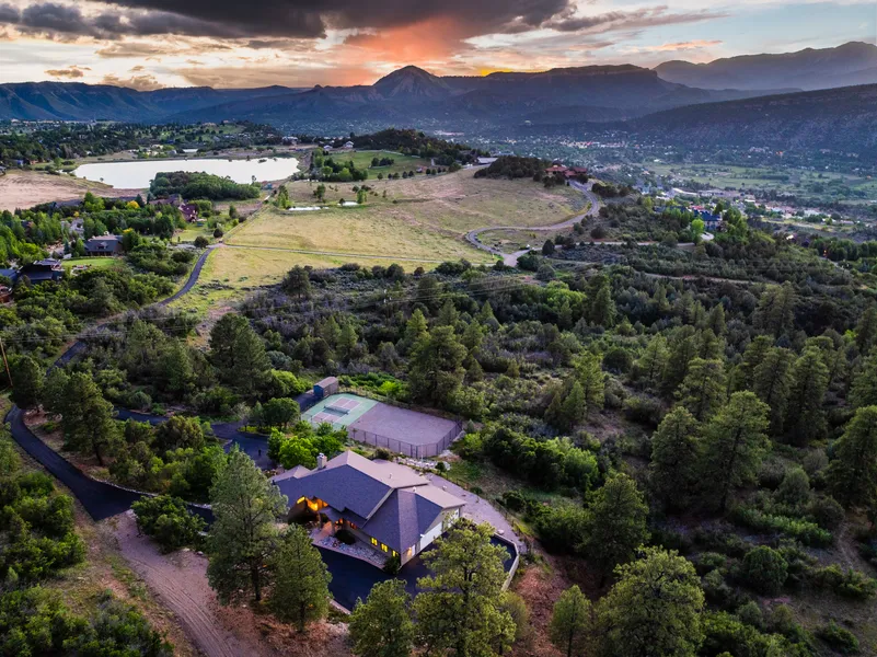 A truly rare offering in the heart of Durango—this contemporary design home is nestled on over 14 acres of private land within city limits. Featuring unobstructed views of Durango’s most iconic peaks—Twin Buttes, Perins Peak, Animas Mountain, and the La Plata range—this property offers an unmatched lifestyle that blends seclusion, luxury, and convenience. With direct access to public lands and expansive outdoor living, this is a one-of-a-kind opportunity in one of Colorado’s most sought-after mountain towns. Perched on a 14-acre parcel, the custom-designed home spans over 5,000 square feet. The home has a light-filled, open-concept living space, including four bedrooms(one non-conforming-no egress) and five bathrooms. Step into a spectacular living room that immediately captures your attention with floor-to-ceiling windows framing expansive views from north to south. The natural light pours in through oversized sliding glass doors, bringing the outdoors in and creating the perfect space for both relaxed living and entertaining on a grand scale, with a beautiful deck for outdoor eating and enjoyment. The heart of the home is the chef’s kitchen, which flows beautifully into the living and dining areas. Outfitted with high-end stainless appliances, a Sub-Zero refrigerator, double ovens, and expansive counter space, the kitchen is designed for both function and style. From the dining area, enjoy awe-inspiring views of the La Plata Mountains that shift beautifully with the seasons. The main-level primary suite is a private retreat complete with a flexible bonus room as well as a spa-inspired bathroom featuring a soaking tub, walk-in shower, and a spacious walk-in closet. Additionally on the main floor; a large walk in coat closet, a half bathroom off the kitchen, and a laundry/mud room with plentiful cabinet space. The lower level of the home continues the theme of thoughtful design and generous living space. Three spacious ensuite bedrooms offer comfort and privacy for family or guests, while a large entertainment area anchors the floor with room to relax, host game nights, or simply unwind. Additional features include a private sauna, a large secure storage room with a high-end walk-in safe, and access to the pool room—complete with a small indoor pool for year-round enjoyment. Step outside to a massive concrete patio that leads to a professionally finished pickleball court (prepped for additional tennis or pickleball court) and beautifully landscaped grounds, all set against a breathtaking mountain backdrop. This home was built for embracing the outdoors. With the Skyline Trail and BLM land directly behind the property, endless hiking, biking, and running trails are literally in your backyard. After a day of adventure, soak in the hot tub or take in the panoramic views from your private patio spaces. The home also features a three-car garage (with radiant in-floor heat) and two separate driveways—one leading to the main home and another directly to the pickleball court for easy guest access. All of this is just minutes from downtown Durango. Hillcrest Golf Course is a quick drive away, and easy access to local schools, restaurants, and recreation means you're never far from what you need—despite feeling like you’re on your own resort. Properties like this don’t come around often—especially with this much land, privacy, and flexibility so close to town. Whether you’re searching for a private mountain retreat, an entertainer’s dream, or a long-term investment, this is one of Colorado’s most vibrant mountain communities!