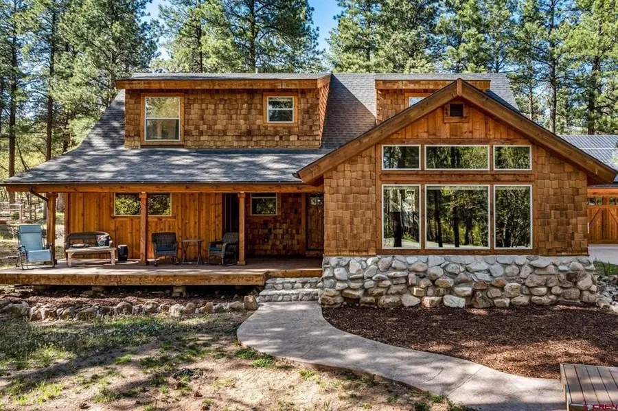 John M Wells, The Wells Group of Durango, LLC, C: 970-749-1440, , : This brand-new, energy-efficient solar home combines modern living with serene natural beauty and outstanding curb appeal. It’s nestled on a 0.94-acre lot surrounded by pine trees in Edgemont Ranch. Featuring a contemporary open floor plan, the main level includes a private master suite, a dedicated office, a powder bath, a spacious kitchen, a separate dining room, a comfortable living room, and a versatile laundry/mudroom conveniently located at the garage entrance. The main level is heated with hydronic in-floor heating divided into four zones and complemented by a cozy natural gas rock fireplace. The kitchen is a chef’s delight with granite countertops, a large prep island with built-in storage, and beautiful alder cabinetry that continues into the adjacent laundry room for added functionality. Interior finishes include stunning tongue-and-groove knotty Douglas fir vaulted ceilings and warm hickory hardwood flooring throughout. The master bathroom is elegantly appointed with dual vanities, cascading glass vessel sinks, and a fully tiled walk-in shower. Upstairs, you’ll find two generously sized bedrooms—each with walk-in closets and built-in shelving—separated by a full bathroom and a bright family room with vaulted ceilings. Enjoy ample natural light and southern exposure. Above the attached two-car garage, a full array of solar panels captures energy, storing excess electricity for future use. The blacktop driveway leads to a stamped concrete walkway and a charming footbridge to the front porch. Located in desirable Edgemont Ranch, residents enjoy access to community walking trails, tennis courts, and exclusive fly fishing privileges on the Florida River. With the privacy of a nearly one-acre wooded lot and the convenience of being just 15 minutes from downtown Durango, this home offers the best of both e take a look—you’ll love what you see.
