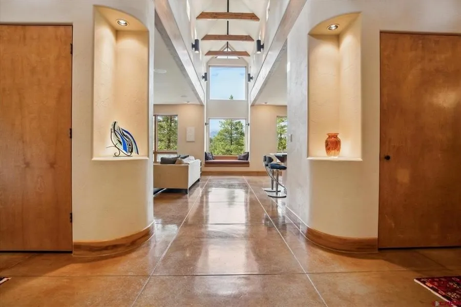 Christina M Rinderle, Durango Land and Homes, C: 970-946-2279, , Welcome to this meticulously crafted 4,397 sq ft residence, gracefully set on 11.26 acres within a private, gated enclave of just six homes. Designed by renowned architect Dallas Reynolds, built by Gary Whalen, and blessed by Eddie and Betty Box of the Southern Ute Tribe, this exceptional property masterfully blends artistry, functionality, with the unique feature of a large 4-person elevator, and comfort in every thoughtful detail. A flagstone patio and circular paved driveway create an inviting approach to this one-of-a-kind home. The main level opens to an elegant foyer, which leads to the open living room and kitchen offering tranquil views of the Ponderosa pines and the La Plata Mountains beyond. Art niches with recessed lighting provide subtle design accents throughout. Off the main hallway you'll find a private offi...