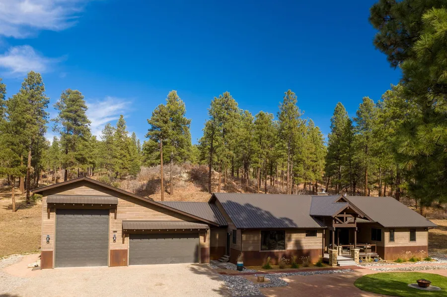 EQUESTRIAN ESTATE NESTLED IN THE PINES! This spectacular 35 acre property located in the desirable, gated community of Eagles Ridge features a custom built home and brand new 5 stall barn that is sure to impress even the most discerning of horse lovers. HOME: The custom mountain contemporary home was built in 2017 and consists of 2200 square feet of living space with 2 ensuite bedrooms and plenty of room to entertain indoors and out. As you enter through the front door you are welcomed by a spacious great room with T&G vaulted ceilings and beautiful wood floors that open to the dining area and gourmet kitchen. Not a detail was spared in the well-designed kitchen which features granite countertops, custom cabinetry and lighting, a walk-in pantry, high end appliances including a Blue Star gas range/oven and a Wolf induction cooktop. The large island offers countertop dining and a prep sink. On the east wing of the home is the primary bedroom with a gas fireplace, walk-in closet, spacious bathroom complete with dual sinks and steam shower, and private access to the hot tub. In the west wing of the home is the secondary bedroom with 2 closets, ensuite bath, and private entrance. A large laundry/mud room accesses the oversized 3 car garage with RV/boat bay, utility sink, attic storage access, and plumbing for a propane heater. In the event of a power outage, a backup generator system in the garage runs the well pump for the home and barn, as well as the kitchen appliances and essential lighting. Other highlights include Restoration Hardware light fixtures, in-floor radiant heat, Sonos surround sound, whole-house fan, and irrigated front yard.Back patio has a gas fire pit, a gas line for grill, and is wired for TV. Utility room houses water filtration & softener. BARN: This thoughtfully designed custom Barn Pros barn was extensively customized with the safety and comfort of the horses in mind, as well as many functional, elegant features incorporated to make caring for your animals easy and enjoyable. Features include upgraded Classic Equine stall and aisle doors, safe high-grip aggregate concrete aisle, insulated ceiling keeps the barn warmer in winter and cooler in summer, 5 stalls with rubber mat flooring and safely placed outlets, upgraded metal roof has snow fencing and gutters with heat cable and drains, 3 wifi-ready surveillance cameras to check on horses in stalls and paddocks remotely, extensive LED lighting indoors and out, high-end oversized ceiling fans, wash/groom stall with hot & cold water and full size garage door for ventilation and paddock access, shed row roofs on both sides of barn offer paddock shelter on east side and equipment storage on west side with an additional enclosed outdoor storage room on the west side of barn. The large heated tack/feed room is complete with ceiling fan, half bath, washer/dryer, refrigerator, kitchen style counter space and storage, stainless steel sink and wifi-ready Weather Underground weather station. The large flex space next to the tack room was originally used as an art studio and could be finished as an office or used as a large weather safe storage space. This heated space has an oversized utility sink, bright LED lighting, ceiling fan, and access to both the barn aisle and exterior shed row storage area. The hay room features finished concrete floors, a sliding barn door for easy feeding access, and a full size garage door for hay deliveries. LAND: This private, quiet and peaceful gently rolling 35 acre estate is prime for hiking, mountain biking and cross country skiing with an abundance of wildlife. A considerable amount of fire mitigation cleanup has been completed around the home and barn. LOCATION: Located just 6 miles from downtown Bayfield, 25 minutes to Mercy Regional Medical Hospital, 30 minutes to the Durango Airport and 30 minutes to historic Downtown Durango. This tastefully design equestrian's shangri-la has been meticulously cared for and is not to be missed!