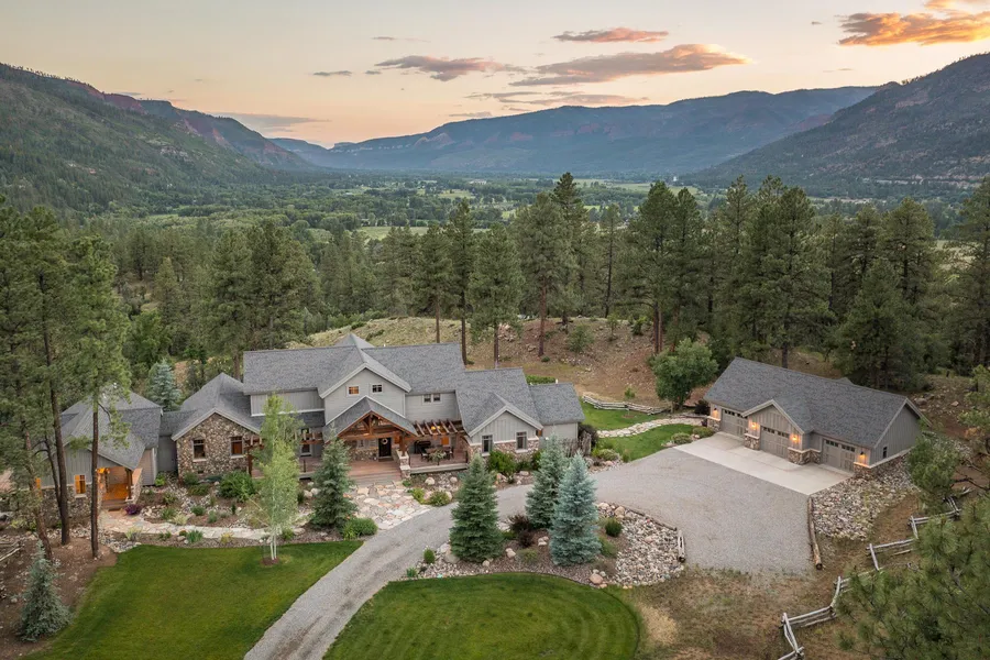 Situated just off the Gold Coast of County Road 250, this property brings the Colorado dream to life every season. Fall in love with this private and secluded 35-acre property that borders the national forest and is situated to take advantage of the incredible Animas Valley views. The 4,182 SF modern custom home is an architectural masterpiece featuring 4 bedrooms, 4.5 baths, and an attached 1,000 SF 2 bedroom, 2 bath guest house/ADU. This home is the epitome mountain elegance with views from every window and lovely finishes, including granite countertops, custom knotty alder cabinetry, white oak flooring, tiled bathroom floors, and gas river rock fireplaces throughout. Its further enhanced by most of the furnishings being included in the sale. The entire house has efficient in-floor radiant heat keeping it nice and cozy on those fall and winter nights. The main level has a wonderful open floor plan, with the spacious living room flowing seamlessly into the dining room and gourmet kitchen with finest appliances. The large main-level master suite has its own gas fireplace, double vanity with custom cabinets, a soaking tub with mountain views, rain shower, and a large walk-in closet, creating the perfect personal spa to relax and enjoy each morning or evening. The main level also features a separate media room with adjacent powder room, and a large mud/laundry room off the kitchen with a sink and dog wash. On the second level of the home there are 3 spacious and comfortable guest suites with beautiful finishes and spectacular views from each window. The outside living area has several decks and pergolas to soak up the majestic red cliffs and Animas Valley scenery. The exterior landscaping includes gardens serviced by sprinklers and a drip irrigation system providing easy maintenance. The property has a combination of Spruce and Pine woodlands and open spaces with access to the National Forest. There is a detached oversized 3-car garage providing parking and storage for equipment and recreational toys. And, to add to the accommodations there is a wonderful attached 2 bedroom, 2 bath guest house/ADU with private entrance, large living room and kitchen, engineered hardwood floors, quartz countertops throughout, a private deck with expansive views, and a 1 car attached garage on the lower level. This is Colorado living at its best with magnificent views of the surrounding mountains and valley, while only 20 minutes from historic downtown Durango or Purgatory Resort.