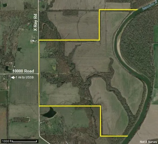 326 acres--180 in cultivation, 90 in pasture, trees, 1 mile Neosho River frontage, 2 rural water meters.