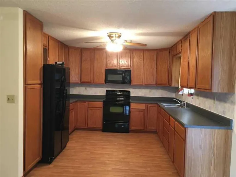 The home has central heat and air, and a large open living and dining room. Patio doors on the back and a small front porch. Home also comes furnished with washer and dryer, refrigerator, cook stove, and built in microwave.