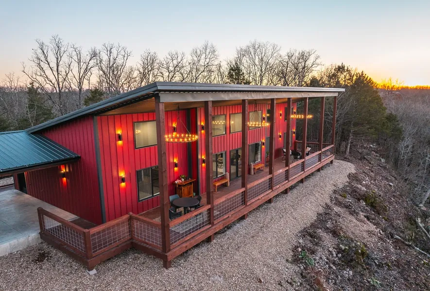 Located in Laclede County The Rivers Edge is an amazing new construction custom home sitting on 13 m/l acres with unbelievable features. This 2100 sq ft 4 bed 2 bath home checks all the boxes with a modern/rustic architectural style . The Single slope roof design gives maximum natural light and picturesque scenic views of the Gasconade river and the beautiful surrounding farmland. Live in comfort and style in this open floor plan with custom knotty alder cabinets and granite countertops, Primary suite has a large custom Onyx shower with glass wall and crafted distressed beam with bluetooth stereo lighting. Main living space features giant stone gas fireplace with a custom live edge mantle and a propane hot water heater. The wow factor of this home is the over 1,500 sq ft of outdoor entertainment space overlooking the unbelievable valley views of the Gasconade river. Enjoy the views of na...