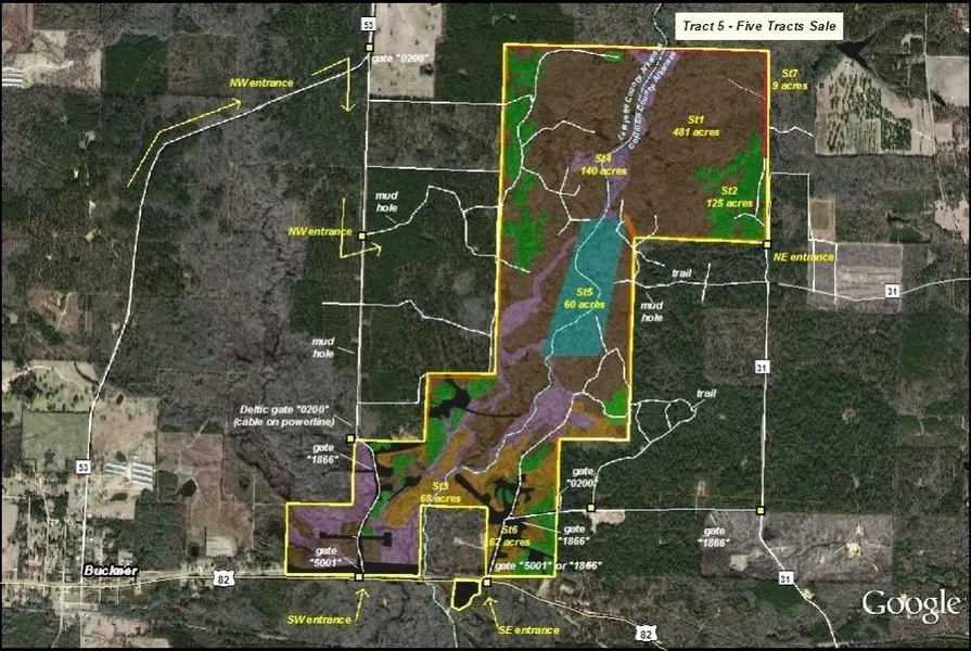 Access: Tracts 1-4 by Lafayette County Road 25 and gravel oil field roads; Tract 5 by paved State Highway 82, gravel Columbia County 31 and gravel oil field roads.