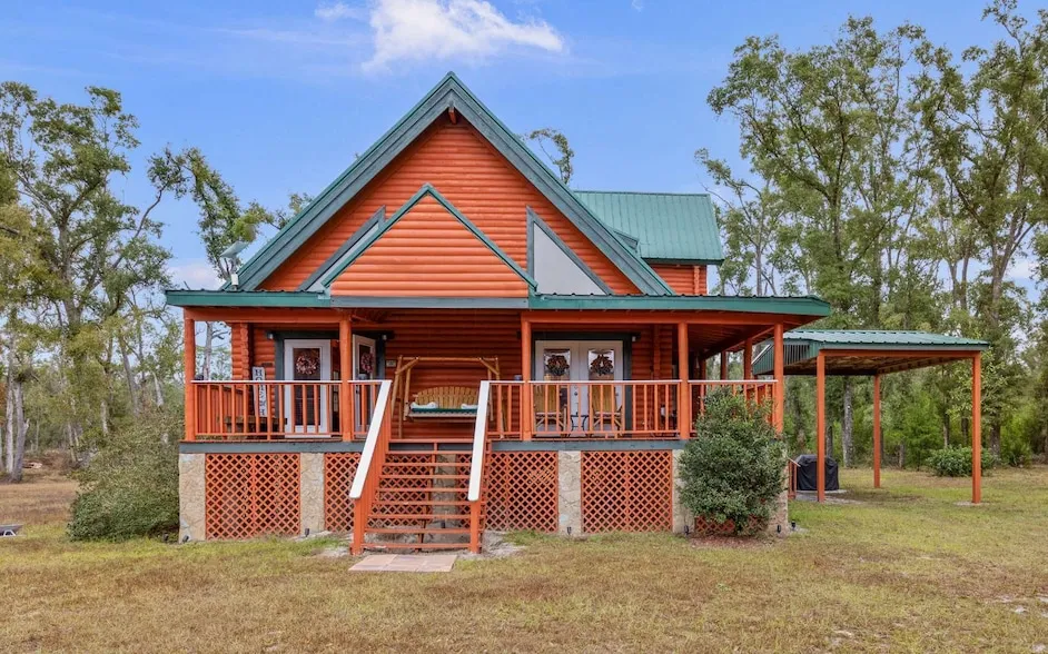 Escape to your own private nature retreat with this stunning 2,102 sq ft log cabin on 19.61 fully fenced and gated acres, located just one block from the world-renowned Suwannee River with a public boat ramp. This 3bR/2Ba home offers the perfect blend of rustic elegance, privacy, & convenience only 15 minutes from Live Oak & Branford. The home features warm wood interiors, generous living areas, and a functional layout perfect for full-time living or a weekend getaway. A 50x30 barn with a concrete slab floor and upstairs loft storage provides exceptional space for equipment, RVs, boats, hobbies, or a home business. The expansive acreage offers endless possibilities including recreation, gardening, livestock, or future expansion. The back 10 acres has 2 wells, septic and electric hookup, a full perimeter fence with a front gate. Also has a cement pad which can be repurposed for a 2nd home, or short term rentals. Easy access to the beautiful Suwannee River where you can canoe, kayak, swim, and fish. Minutes from various local springs such as Royal, Charles, Peacock & Lafayette Blue. A quick 30 min drive to Steinhatchee on the Gulf of Mexico for saltwater fishing and scalloping. Enjoy easy access to boating, fishing, kayaking, and river recreation while maintaining total privacy and security with fenced and gated grounds. This Suwannee River area property is ideal as a primary residence, vacation home, hunting retreat, or investment opportunity! *All furnishings are negotiable