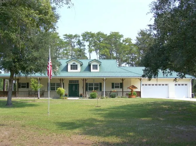 This property shows much pride in ownership even before you step into the home. There's a concrete drive all the way to the garage and front porch with brick pillars at the entrance. As you approach the garage you see the guest house, decorative wishing well and very cute pump house to your left. There's an attached 2 car garage plus attached to the side of that is a yard equipment garage with roll up doors on both ends for drive-thru convenience. The home features a wonderful covered front porch that wraps around one side of the home, nice green metal roof, skylight dormer & Travertine tile with deco tiles at entrance, crown molding, 2 master suites, formal dining room to the right of the entry currently being used as a formal living room, office to the left of the entry that could be a 3rd bedroom, family room straight ahead with beautiful Tiger Oak surrounded gas fireplace on brick wa...