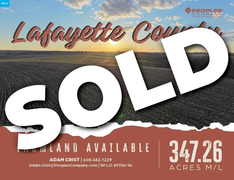 Peoples Company is pleased to present a unique 347.26 acre property situated in the scenic rolling hills of Lafayette County. There are 182.62 FSA cropland acres with an NCCPI rating of 63.9. The primary soil types are Newglarus, Palsgrove, and Arenzville silt loam. The farm boasts long straight rows, rich soils, and hard-surfaced access to Dunbarton Road and Patch Road. The lively Wolf Creek stream runs year-round through the abundance of pasture, providing plenty of water access for grazing cattle. The new buyer will have plenty of options for grain merchandising, as there are three local grain marketing elevators within ten miles and an ethanol plant within twenty-five miles. These grain outlets can be accessed by both county and state paved highways.