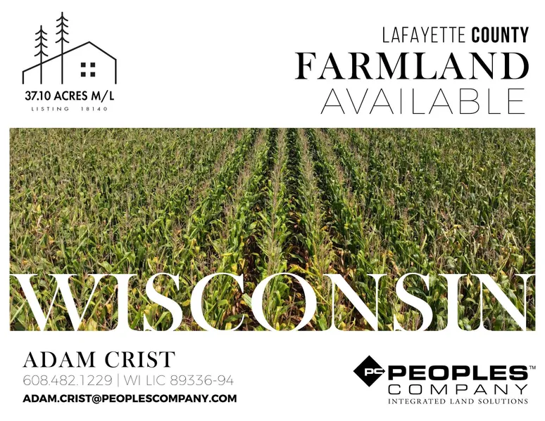 Peoples Company is proud to offer a rare and versatile 37.10 surveyed acres of farmland in Lafayette County, Wisconsin, near Argyle, Wisconsin. The farm has an estimated 31.65 tillable acres with a Productivity Index of 60.2. The primary soil types are New Glarus and Palgrove silt loam, productive soils for farming or leasing for additional income.