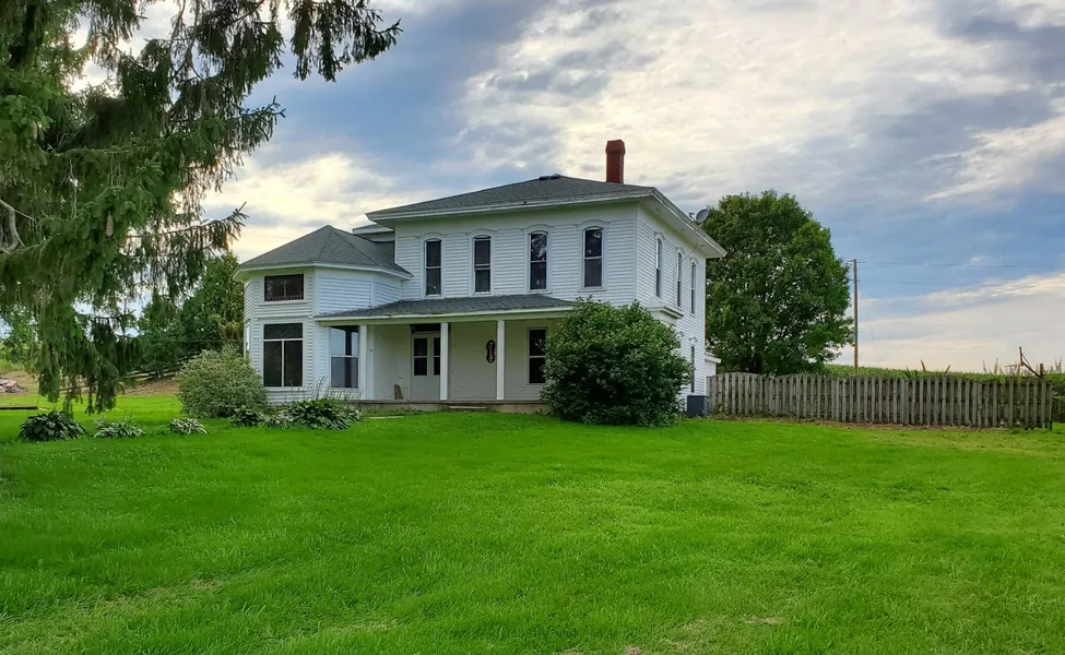 Rural property, Must have been the most elegant older home featuring pocket doors, open staircase, beautiful woodwork, leaded glass, newer furnace, tons of room and good location. Complete set of outbuildings including a dairy barn with 104 tie stalls, bulk tank, and milking equipment. Misc. assortment of outbuildings including a large machine shed. Pasture and about 3 acres of tillable ground currently pasture. This is a home for country gentleman/woman to enjoy!