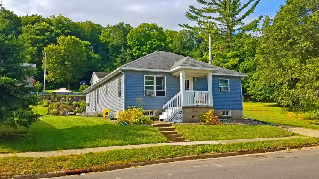 Attractive 3 B/R, 2 bath ranch home on quiet street near downtown, features spacious open floor plan, kitchen island, all appliances, 1st floor laundry, partially finished lower level, vinyl siding, newer windows/roof and furnace. Security system, landscaped yard with fish pond and canopy, off street parking with room for a garage!