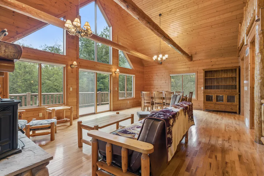 Inside, youll find three spacious bedrooms and two full baths, providing plenty of room for family or guests. Two of the bedrooms feature walk-out balconies, the perfect place to enjoy morning coffee while overlooking the rolling countryside. The homes interior is anchored by crafted hardwood floors, a centerpiece stone fireplace, and large picture windows that frame breathtaking views. All furnishings are included, offering a seamless move-in opportunity. An unfinished walkout basement provides abundant potentialwhether for added living space, a workshop, or a recreation room.