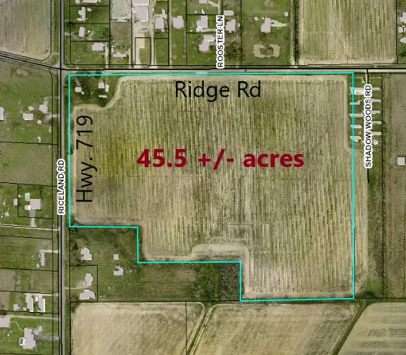LOCATION! LOCATION! LOCATION! Great opportunity to own one of the few undeveloped corners on the west side of Lafayette Parish. This 45.5 +/- ac tract is located on the southeast corner of Ridge Road and Riceland Road (Hwy. 719). It offers approx. 2,500' of road frontage and is in Flood Zone X. Most of the property is currently being farmed. The old house and remaining structures needs to be abandoned and are not considered of value. This leaves so much potential for such a great location. This opportunity won't last long. 45.586 +/- acres offered at $546,000. (approx. $12,000/ac) to be sold all together.