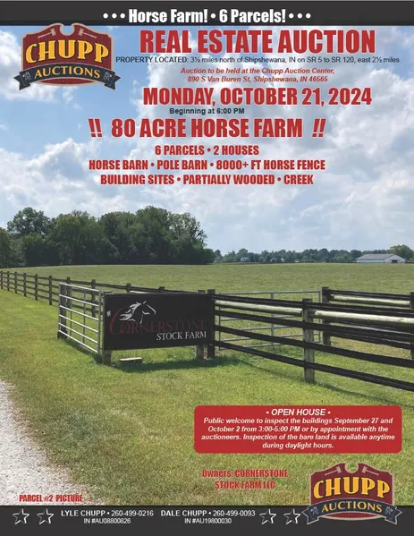 80 acre parcel, contains two homes, three barns and over 8,000 ft of horse fence.