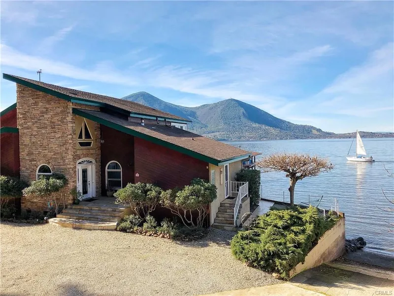 Stunning lakefront estate located on California's largest natural lake! Picture windows surround you in almost every room with sweeping views of Clearlake and Mt Konocti. Beautiful Great Room with 3-sided fire place, opens through arches to the granite kitchen with impressive center island. Private master BR -- awake to sweeping views & cozy fire place, exit the slider to the deck, soak in the beauty while enjoying your morning routine. 2 Additional BR with walk-in closets are on the ground level. 2nd level of the home featuring 2 additional BR with walk-in closets. Slider doors lead to the wrap around upper deck off the Game Room with a cool vintage pool table, custom built-in media center, fire place, & wet bar. The expansive outdoor living spaces accommodate entertaining from wrap-around decks at both levels, flagstone patio with fire pit, on-the-water deck showcased by fully landscap...