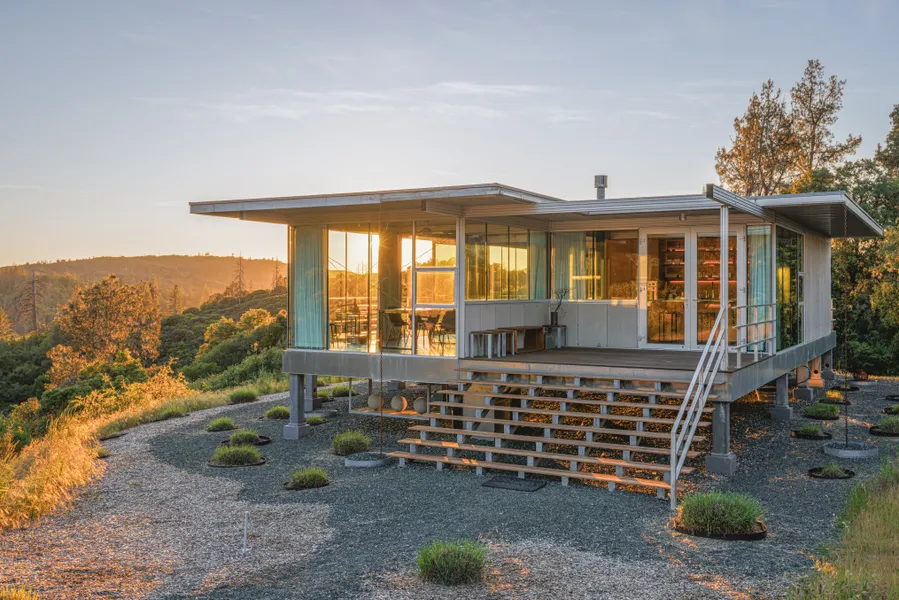Modern Glass House on 64.5± acres just 20 minutes from downtown Hopland. This residence is a minimalist masterpiece situated on the Mendocino & Lake County Lines. Featured in Dwell Magazine, this stunning one-bedroom home features floor-to-ceiling glass walls, high-tech finishes, an outdoor concrete soaking tub, and a sleek contemporary design by Los Angeles-based architect Linda Taalman. A short distance away a detached guest house, designed in materials to compliment the main residence, with a warm inviting Douglas fir interior, provides a second bedroom and an office/fitness space, a stylized bathroom, and a sauna, all with panoramic views of the distant Mayacama's Mountain Range and the calm blue waters of Clear Lake. This state-of-the-art, off-grid property is powered by highly efficient roof-mounted solar panels with a separate battery bank and propane generator for reliable power. For anyone wanting to immerse themselves in nature and be just two hours from San Francisco, this meticulously maintained property is a perfect and serene getaway.
