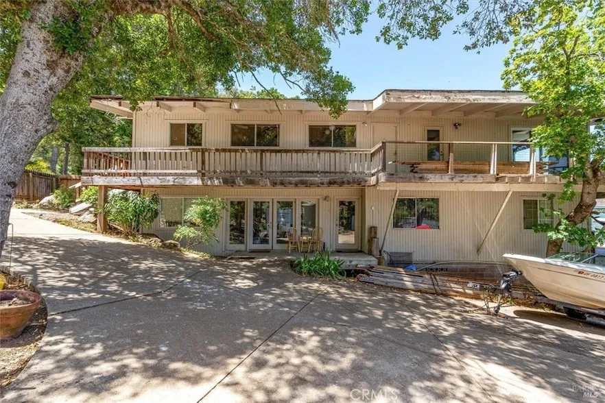 Motivated seller! Value on the Lakefront! This property offers two homes on a private 6 ACRE lot. The main home has a Mid Century style, with Spanish Style Terracotta tile floors, exposed beamed ceilings. The bright and open floor plan combines the kitchen and great-room with carpet, and wood style stove. This room is the perfect place for relaxing and gathering as you soak in the lake view. Original wood walls flow through to the Bedrooms with carpet. The Main home has 6 bedrooms and 2 full bathrooms plus an additional lower family room. The Separate 2 bedroom and 2 bath guest house was designed with a living room with kitchen combo and a lower hall bath with shower. A Spiral staircase leads to upper 2 bedrooms with lake-views and 2nd upper Hall bath. Additional amenities include a private concrete boat launch, a private dock, an aluminum stainless floating dock, and private beachfront. Pull through driveway allows extra space for RV or Boat parking. The 1.99 acre lot offers serenity and peace from the numerous patio areas, large oak trees and native plants adds to the beauty and natural shade of the outdoor spaces. The addition 4 acres offers a lakeview building pad and some utility s . Enjoy year-round water sports, fishing and birdwatching from your own piece of heaven. Located on Clearlake California's largest natural lake for outdoor adventure, clean air and great wines. There are NO short term rental restrictions in this area. Live in one, rent the other or purchase a large compound for all to enjoy!