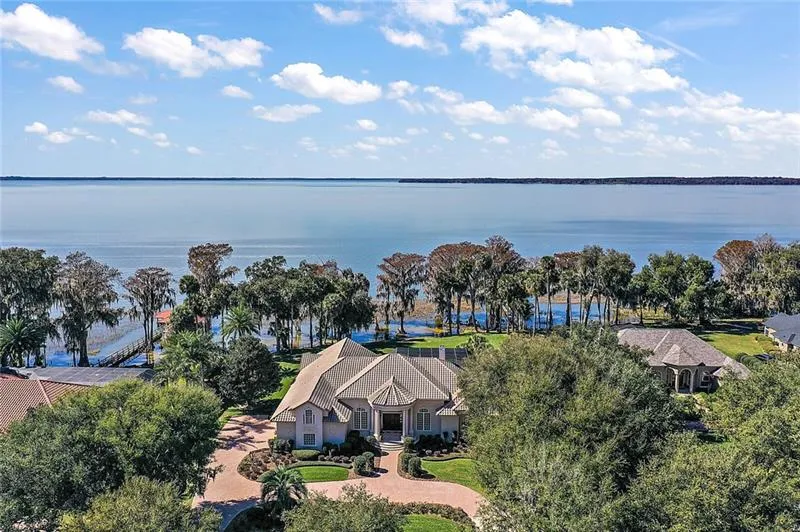 LAKE HARRIS-CHAIN OF LAKES CUSTOM ESTATE POOL HOME WITH BOATHOUSE ON 1 ACRE IN PRIVATE GATED COMMUNITY. The Peninsula is a sought-after, exclusive Tavares enclave of only 17 parcels. Luxury custom homes situated on acre estates with moss-laden oaks and prime Lake Harris frontage. Peace and tranquility abound as you arrive home to this exquisite, 4,309 SF home constructed with superb craftsmanship and attention to detail. The grand architecture, complete with cast stone details, tile roof, soffit corbels, and covered front entry, is further enhanced with pristine, lush landscaping outlined by a paver, circular driveway side-entry drive to a 3-car garage. 8 ft. solid wood entry doors open into a palatial interior with soaring 17-foot custom-trimmed tray ceilings, wide crown molding, and baseboards, custom-fit Plantation shutters, Travertine floors, artist murals and paint finishes, cast stone columns and fireplaces, locally crafted ironwork details, and lighted art niches. Upon entry, the front living room boasts panoramic Lake Harris views that will entrance you, as will the magnificent lake sunset views! The living room has a gorgeous stone gas fireplace and telescoping glass doors to the pool lanai. Adjacent is a formal dining room perfect for hosting holiday celebrations. The well-appointed kitchen is complete with custom wood cabinetry, granite counters, commercial-grade appliances, including a gas range, prep island with storage and extra sink, pass-thru window to lanai, amazing Butler's pantry with sink and wine refrigerator. Open to the kitchen is the family room with a dining nook, gas fireplace, built-ins, huge windows with lake views, and a glass slider to lanai. A separate study with built-ins and desk is ideal for an office or cozy library. The carpeted master retreat is expansive with a 2-sided gas fireplace to the lanai, lake views with access, work-out area, and wet bar. Spa-worthy en-suite with dual granite sink vanities, double walk-in closets, jetted soaking tub, and walk-in shower with multiple sprayer jets. 2 guest bedrooms share a Jack and Jill bath and a convenient desk work-station in the hallway. A half guest bath provides pool access, and the impressive, custom iron stair-railing leads to the upstairs bedroom or bonus room. This spacious room offers a walk-in closet and a beautiful full bathroom with a Travertine shower. It's perfect for extended guests or as a private media room. The outdoor living areas are as impressive as indoors! A fully screened lanai offers unparalleled lake views, plus a wet bar and covered areas for entertaining large groups by the fireplace. The mosaic Travertine granite floor steps down to the paver pool deck with a sparkling pool and jetted spa. A lighted paver path leads to the covered boathouse with upgraded metal, electric boat hoist. Enjoy 161 Ft. of Lake Harris frontage and Chain of Lakes access. Mission Inn is but a few minutes away, offering fine dining, golf, and tennis. Relax. Explore. Enjoy the front row seats to the Harris Chain of Lakes living!