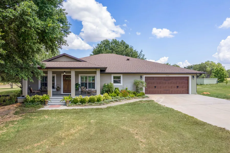 5 acres with a gorgeous custom home with frontage on a pond. Relax by the fire pit and enjoy a beverage while the sun sets across the water. Bring your horses and animals, plenty of room to roam here. What a wow factor this home has from the minute you enter. The views through the home out to the property are awesome. Bamboo flooring throughout most of the home starts in the front formal living room and carries through to the massive great room. The vaulted ceiling and wall of French doors give this room a spacious feel. The dining area is so flexible, room for the largest of furniture here - buffets, hutches, even a table for a dozen or more. Gorgeous chandelier above the table. Right alongside the dining room is this magnificent kitchen, both in space and in quality! Huge slabs of stone for countertops, breakfast bar and the huge center island. Pendant lights over both the breakfast bar and island, along with the recessed lighting makes this incredibly bright and light. Custom cabinetry package has pullouts/drawers, crown molding, upgraded hardware - even under cabinet lighting. Tons of storage, plus a walk-in pantry. The tiled backsplash coordinates with the countertops and floors and the contrast against the rich cabinetry is a perfect combination! Stainless steel appliances including built-in ovens, gas cooktop and vented hood make any cooking, baking or entertaining a dream. Certainly a focal point of the home, this kitchen is amazingly inviting. The family room just got some fabulous custom drawers and shelving installed and left enough room for a massive flat screen TV! Decorative fireplace with amazing hues has been installed under the TV mount area - perfect ambiance solo or while watching TV. The master suite is amazing: huge bedroom with tray ceiling, crown molding and French doors out onto the rear porch. The walk-in closet has the built-in shelving system, only one side is shown in the photos (another reason you have to come see this home for yourself!). The tiled floors in the master bath perfectly accent the sink, accent tile on the garden bath and the walk-in shower. No detail forgotten here either: tiled accent wall, even a built-in shelf! Natural light can enter in the transom window over the tub but leaves the room ultra-private! The guest bedroom is very large, has bamboo floors, plantation shutters and large closets! The second bath has a gorgeous tiled wall, custom vanity and walk-in shower. The tiled shower wall and floor complement the bath schemes. Extra-deep shelving behind the bath door for all those extra towels, etc., but you still have an extra-large linen closet in the hall between the other two bedrooms. The third bedroom is at the rear of the home with French doors that lead out onto the rear porch, offering peaceful views! Rocking chair front porch and lounge chair rear porch both have views of gorgeous property. The wildlife is amazing, including the sand hill cranes that come every year with their babies! Need a work-from-home space? How about this detached building with AC? It can be also a playhouse or art studio! Add the rear yard shed, the two-car attached garage (complete with charging station for your electric vehicle!). Mostly fenced, gated entry onto your concrete driveway. No HOA! Close to the turnpike, all major roads Ocala, Clermont and Orlando International Airport is only 40 minutes away! Upgraded conveniences include tankless hot water heater, crown molding, even an EV charging station.