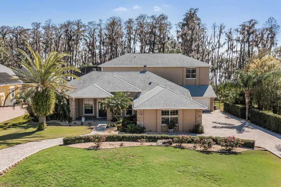 Direct lakefront home on the Clermont Chain of Lakes! Gorgeous, immaculate pool home has 4 bedrooms plus a den/office, game room and study loft. The brick pavers on the circular drive lead you to the front door, welcoming you into cozy, formal living and dining rooms. The home then opens up with views out the triple sets of French doors out onto the lanai, pool and awesome views of the lake. The kitchen has tons of granite counters, 42" cabinetry, tiled backsplash, stainless steel appliances including built-in ovens, and a massive island with seating for 6-8 surrounding the cooktop with stainless steel hood. As the family room opens to both this and kitchen areas, it is an amazing party house with an accompanying pool. Open the French doors for a dinner party inside conversation and outside mingling on the pavered lanai. Utilize the summer kitchen, complete with grill, sink and refrigerator. The pool has a beach entry, relaxing sounds from the spa and waterfall, and plenty of deck area-entertaining is a dream. There is even a secondary casual dining area with corner fireplace, a perfect sitting area or reading space by the fire. Master suite downstairs with French doors out to covered, pavered patio with outdoor kitchen. Granite counters and dual sinks, tiled walk in shower and closet system in the walk-in closet finish this master bathroom space. There is another bedroom downstairs, as well as a den/office that has French doors and a closet, both adjacent to a full bathroom. Upstairs you have a great study loft area-a perfect spot to curl up on a comfy chair and grab a good book (or put another desk here). The 20x20 game room has French doors that lead out onto the balcony, and it even has a spiral staircase down to the pool deck. Dazzling sunsets across the lake can be yours from both bedrooms and game room, or relax in the evening on the pool deck with tiki torches burning, watching the sun set and the stars appear. Bring your gardening ideas, or add to what is already here - you even get dozens of bunches of bananas each year. Listen to the great horned and barn owls talking to each other, watch the eagles soar over the lake and do their own fishing. Towering trees, a zoysia lawn, fenced yard all lead you to the water's edge, down the boardwalk and to the 36x12 boathouse with lift, 24x12 dock overlooking the water. Lake Louisa State Park has more than half the shoreline. Bring your ski, pontoon or fishing boat, jet skis, paddleboards, kayaks and canoes and enjoy all that the Clermont Chain of Lakes has to offer, all from the edge of your dock. Within 45 minutes of the Orlando international airport, Disney/Universal attractions, major malls, and less than 10 minutes to movie theaters, shopping, grocery stores/restaurants. Car enthusiast? There is an attached 3-car garage and a 2-car garage (20x30) that has 13' ceilings with overhead doors at the front and rear of the garage, perfect for two car lifts. Plenty of extra space for a boat or vehicle, and n HOA to tell you otherwise. Since this home has been impeccably maintained (new roof and outdoor kitchen-2018, new ACs-2018/2022, pool resurfaced 2021, all wood on the boardwalk/dock replaced in 2022) plus all the other updates done regularly at this home, there is truly nothing left for you to do! Please take the time to get a glimpse of what this home has to offer with the attached interior/drone video, then make your appointment to come see this beautiful home and property!