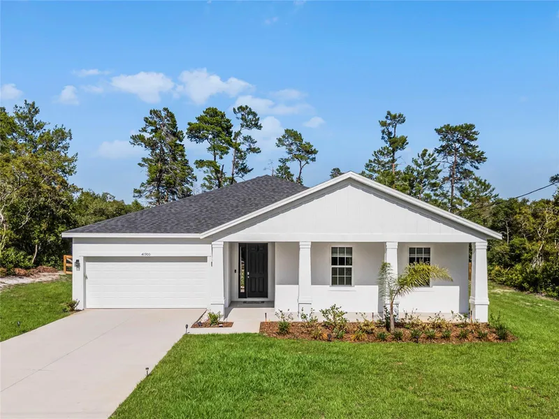 Welcome to this charming 4 bedroom, 2.5 bathroom home nestled in the serene Royal Trails community of Eustis. Built in 2022, this property sits on a fenced acre of land, offering both privacy and space. Step inside to discover an inviting open floor plan that seamlessly connects the living, dining, and kitchen areas, creating the perfect environment for entertaining. The heart of the home is the spacious kitchen, boasting a modern open concept design and elegant quartz countertops, providing both functionality and style for culinary enthusiasts. The master suite offers a peaceful retreat with ample space, accompanied by a luxurious en-suite bathroom complete with dual vanities, a soaking tub, and a generously sized wrap-around shower. Three additional well-appointed bedrooms ensure plenty of room for all. Outside, enjoy the tranquility of the expansive backyard, ideal for outdoor gatherings, gardening, or simply relaxing in the Florida sunshine. In the Royal Trails community, enjoy the abundant wildlife and a deeded private access to Lake Norris, a picturesque freshwater lake known for its crystal-clear waters and excellent fishing opportunities. Residents have exclusive rights to indulge in a variety of water activities, including boating, kayaking, and paddleboarding, providing endless opportunities for outdoor recreation and relaxation.