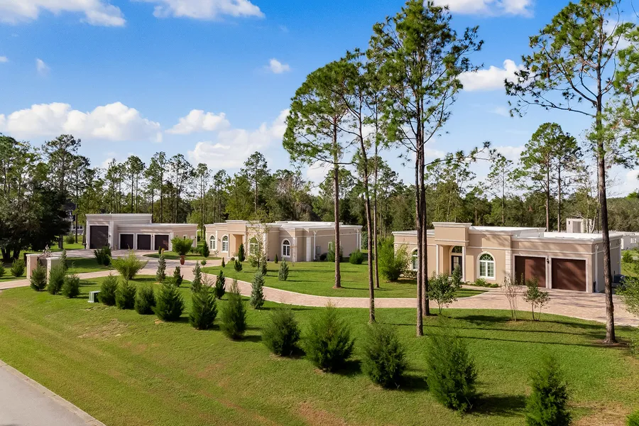 Welcome to a rare opportunity in Central Florida real estate—a private, gated estate in Lady Lake offering two separate residences, RV and boat storage, and fully insulated 3-car garage on 2.35 scenic hilltop acres. Located just minutes from The Villages, and within an hour of Orlando International Airport and Disney World, this one-of-a-kind property is perfect for multi-generational living, snowbirds with RVs, car or motorcycle collectors, or those seeking a quiet, natural setting with easy access to Ocala's equestrian life and major urban amenities. The main residence spans 3,426 ft and features a hybrid open layout with three en-suite bedrooms and 3.5 bathrooms. Thoughtful details include 12' ceilings, 8' solid core doors, custom walk-in closets, and 32" x 32" porcelain slab floors with onyx finish throughout. The kitchen flows with a partial wall opening to the main salon, finished with high-grade stone countertops and porcelain tile bathrooms that blend function with subtle elegance. A porcelain slab with onyx finish fireplace anchors the living room, flanked by French doors opening to a lanai with tranquil views and a newly planted tree line that enhances privacy and green space. All windows are vinyl, double glass, tinted and the fiberglass doors for easy maintenance. The second home is 1,720 interior sq ft, offering a split floorplan with an open-concept living area and an attached 2-car (or oversized truck) garage—ideal for guests, extended family, rental income, or a home office for remote work or a family business. Both homes feature bright, well-designed laundry rooms that elevate everyday tasks. The detached garage structure includes 16' ceilings, commercial-grade doors rated to 150 mph, and is fully insulated, making it ideal for vehicle collectors, secure storage, or hobbyist use. Built with concrete block construction and TPO commercial-grade roofs, this property is engineered for durability and long-term value. Windsor Green is a private gated enclave on a lovely hilltop. The location is unmatched for those who enjoy boating, golfing, or a more relaxed pace of life while staying close to shopping, dining, and top-tier healthcare facilities. Restyle the classic architecture with your personal vision and taste. Enjoy the good life in a natural setting, refined Florida living, built for comfort, flexibility, and long-term potential.