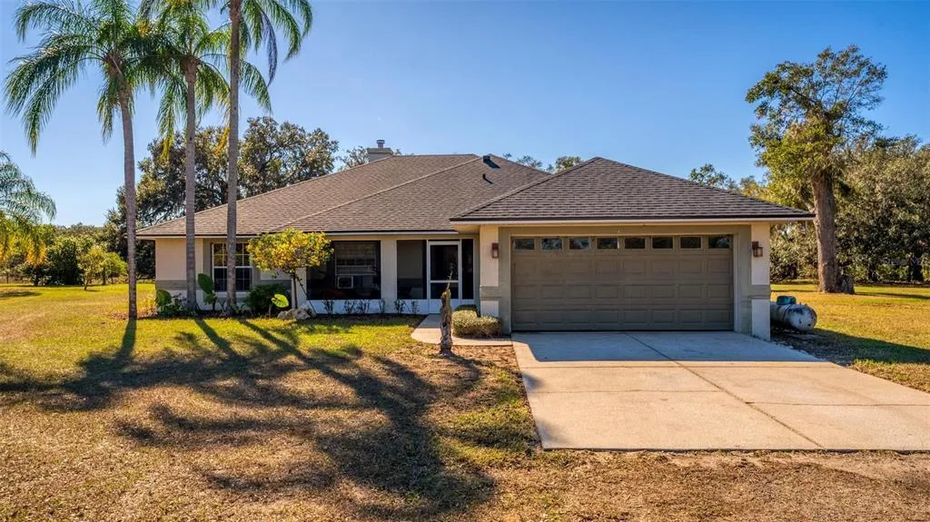 The home is a 1998, 3 bedroom 2 bath, 1,767 sqft open concept ranch with a newer roof (2021) and water heater. The kitchen is equipped with new appliances and a pantry. It opens up to a dining area and great room. It also has a full length screened porch on the back which has access to the master bedroom. This would be a great place to watch the magnificent sunsets. The owner enclosed part of the garage to add an office with its own mini split AC unit. Presently there are window units added for cooling but the home does have (non working) central AC. (We have reflected that in the price). The wood floors were recently added and the owner has done lots of projects around the house to bring it up to date and to show off its personality. There is a gas fireplace for those chilly nights or you could also sit under the stars and warm up around the outside fire pit that sits next to a covered patio or carport. Presently, the owner is using this area as an outdoor summer kitchen with running hot water and with all the cooking needs to host a fun outdoor entertaining event. There is ample room to add a pool if you desire. The property has a well with a well house and a large (owned) water softening system. There is also separate irrigation for the fenced garden area, which sits in front of the home. There is a large storage unit on the property to store your maintenance equipment and it is wired and equipped with a generator to power the house during outages. Also available with this property is a 32' camper which is set up and ready to go for those out of town guests.