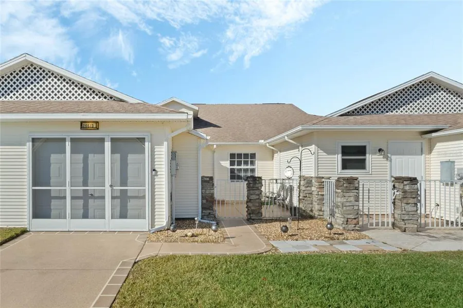 MOTIVATED SELLER-BRING AN OFFER! Courtyard entrance leads to an open floor plan featuring tile floor, all appliances, including natural gas range, bill pay station & breakfast bar. Dining and living room combination offers vaulted ceiling, decorative plant shelves and built in. 8-foot sliding glass door opens to the sunroom, featuring glass windows and access to an open patio beyond. The primary bedroom with en suite bath, boasts a walk-in closet, split vanities with dual sinks, overhead storage space, skylight, and new shower stall. Split bedroom floor plan: the guest bedroom, overlooking the courtyard entry, offers dual closets, vaulted ceiling, and plant shelf details with en suite bath. The oversized one car garage (240sf) is equipped with screen enclosure and attic access. Washer, dryer and Ring doorbell convey. Don't wait............. call now to schedule your private tour! Highland Lakes is a gated 55+ community situated in Central Florida just south of Leesburg & offers residents the following amenities: Recreational Clubhouse with two swimming pools; indoor (heated) & outdoor, a softball field, an indoor arena with a stage for comm. events, kitchen, billiard/ping pong rm., 6 tennis courts (2 courts are lighted & 4 courts have a cushion surface), 8 lighted shuffle board courts, bocce ball courts, pickleball, 7 horseshoe pits, covered picnic pavilion with picnic tables & grills to barbeque, library, meeting/card room, exercise room/fitness, craft room, golf driving range, RV/boat storage is also included & has 260 spaces on a secured lot (fenced & lockable), a Craftsmen building/woodworking shop (homeowners can join the club for only $12 annually and use any/all tools available), there's also a Nature Trail within the community & seven lakes scattered throughout Highland Lakes; 4 are used by residents for catch & release (fishing)!