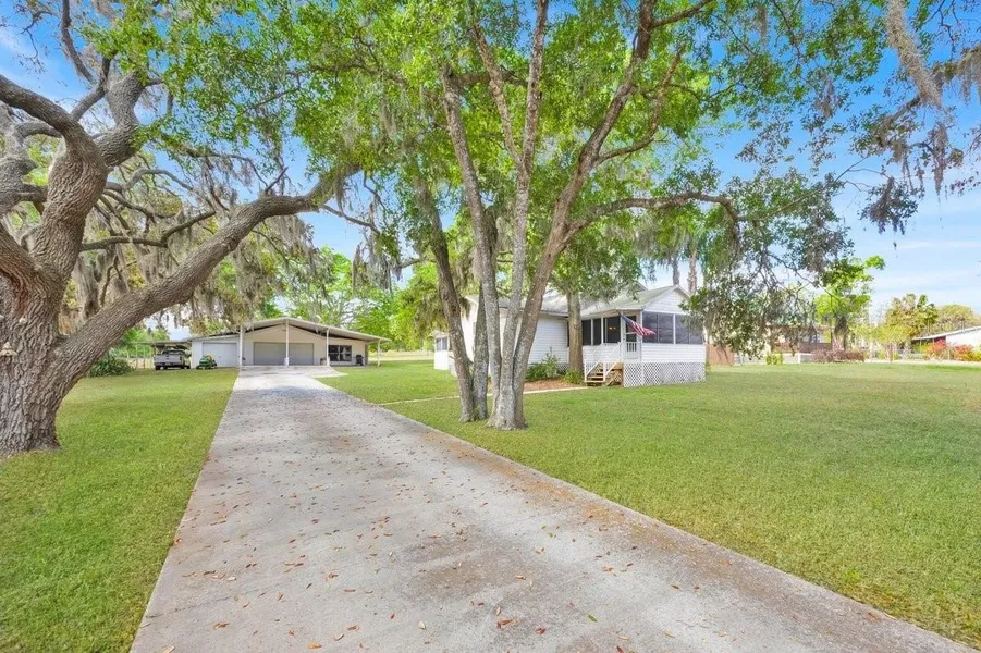 The home features 3 bedrooms, 2 full bathrooms, and a convenient mud room, providing functionality and space for everyday living. A long concrete driveway leads to a large garage with additional covered space, ideal for vehicles, boats, or a workshop. Behind the garage, you’ll find a lawn equipment shed and a spacious open backyard, perfect for entertaining or future expansion.