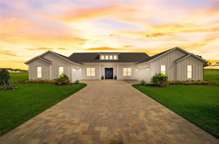 Under contract-accepting backup offers. Bring your Boat and Bathing Suit and prepare for a Fishing Adventure - because this house has it all! A Modern Waterfront Farmhouse with 12- foot ceilings and a pool with private floating dock that provides access to the Harris Chain of Lakes, all from your private backyard. Immerse yourself in the epitome of Florida living. Completed in 2023. Over 1.5 acres located in a private gated community, this immaculately presented three-bedroom, three-bath, single-story home offers versatile accommodation that includes an office, generous bonus Game Room, three-car garages, and an expansive covered lanai, complete with an outdoor shower. Slide open the oversized pocket sliding doors from the main living area spilling out to your private outdoor oasis, welcoming in the stunning natural Florida that surrounds you. Enjoy relaxing under the shaded covered lana...