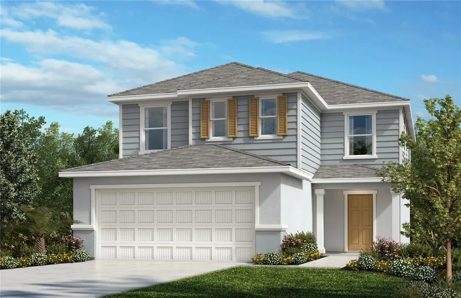 Under Construction. This charming two-story model home features a welcoming covered front porch and a thoughtfully designed open floor plan with 9-ft. ceilings. The main living areas include plush carpet and tile flooring in all wet areas. A convenient laundry room with direct garage access adds everyday functionality. The kitchen offers a walk-in pantry, durable laminate countertops, Whirlpool® appliances, and 36-inch upper cabinets for ample storage. Upstairs, the spacious primary suite includes a walk-in closet and an en suite bath complete with a dual-sink vanity, garden tub, linen closet, and a walk-in shower with elegant tile surround. Flexible living spaces include a downstairs den and an upstairs loft, ideal for a home office, playroom, or additional lounge area.
