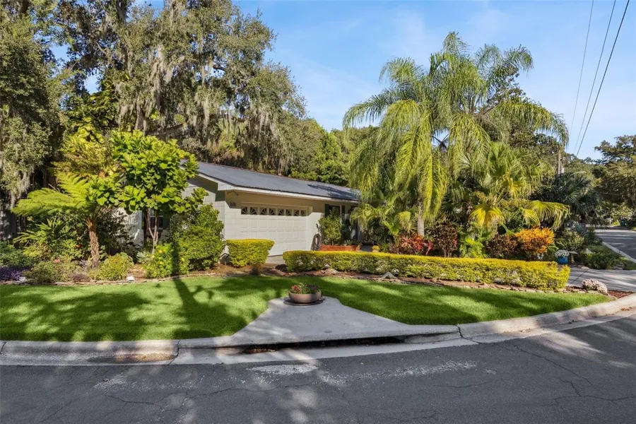 Under contract-accepting backup offers. Bright Mount Dora cottage (2 BR / 2 BA) on a private corner lot — perfectly positioned within easy walking distance to Historic Downtown, the waterfront, and nearby shops and restaurants. Inside, the home is light-filled and move-in ready with fresh paint, crown molding and energy-efficient Andersen double-pane windows and doors. The bedrooms feature warm hardwood floors and the primary suite enjoys French doors that open to the lush garden. The kitchen is well-appointed with granite counters, tile backsplash, stainless appliances and an eat-in nook that flows to the sunroom. Both bathrooms have been tastefully renovated with custom vanities, walk-in showers (the primary with frameless glass and a rain-head), and quality finishes.