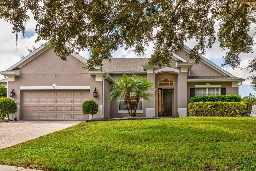Eustis beauty nestled on a serene corner in the sought-after gated community of Blue Lake estates. This home offers tranquil living plus subtle lake views with unbeatable convenience-just minutes from shopping, dining, hospitals, top-rated schools and neighboring city of Mount Dora. Step through the dramatic entryway of cherrywood flooring and discover a thoughtful layout: a private office to the right, adjacent full bath, formal dining to the left, and an open concept living space with 12 ft ceilings throughout that flows seamlessly to the expanded covered porch-blurring the line between indoor comfort and outdoor charm. The lush, landscaped back and side yard is completely fenced adding to privacy, enjoyment and security for pets and young ones. The spacious primary suite is a true retreat, featuring a luxurious en-suite bath with dual vanities, a soaking tub, separate shower, and 2 generous walk-in closets. The split bedroom design ensures privacy, with 2 additional bedrooms, a shared bath and flex space to suit your needs-additional bedroom, hobby spot, home gym, or more living area. Lots of closet and linen space here, in fact the entire home has tons of storage. The kitchen is a chef’s delight, boasting a center Island, breakfast bar, eat in nook, and a layout that invites cooking and connection. A two-car garage includes a fan and handy bump-out—perfect for even more storage, a workbench or extra fridge. Need more storage? The attic is fully floored! This home has been immaculately maintained with new roof Sept 2021, HVAC May 2019, Hot Water Heater and so many improvements and updates. Such as Interior and Exterior Paint, Digital Networking Center, 21 new Can Lights, Custom Pantry, Plantation Shutters and so much more. Priced to sell below market value…Rush to view!