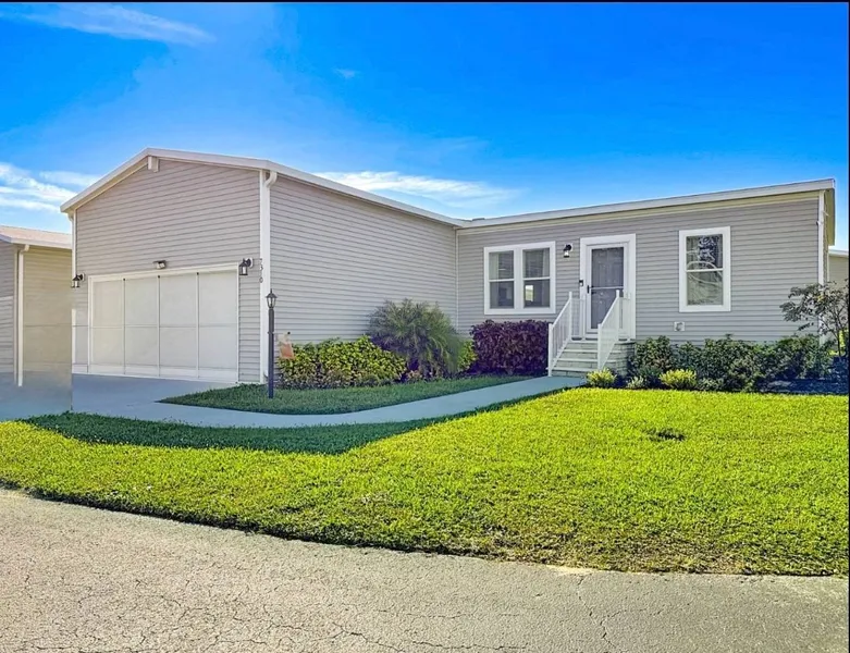 PRICE REDUCED! THIS HOME IS BETTER THAN NEW -- 2023 Palm Harbor 3/2 + GARAGE in the Lakeside 55+ community of Woodlands at Church Lake. CORNER LOT! Welcome home to retirement living at its finest at 7310 Flowering Tree Cir in Groveland, FL! This like new Ranch style home is waiting for YOU as a forever home, second home or your seasonal getaway! Upon entering your residence you'll notice the neutral tones, high ceilings, crown molding, top quality LVP flooring throughout, open concept flow of the Kitchen - Living Room - Dining Room featuring counter seating at the expansive Kitchen island, tiled backsplash, modern finishes, stainless steel appliances, PLUS all appliances remain! Kitchen offers a generous amount of cabinets for storage and plenty of counter space for cooking and entertaining. The split bedroom layout offers privacy for your guests with the guest bathroom offering a tub/s...